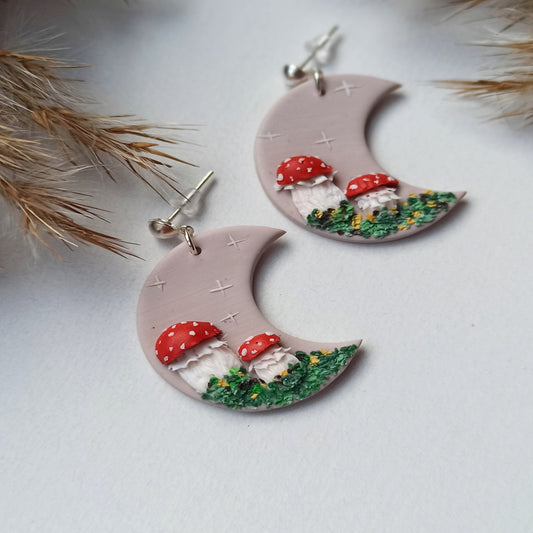 Handmade Mushroom Moon Earrings | Polymer Clay Cottagecore Jewelry Gift