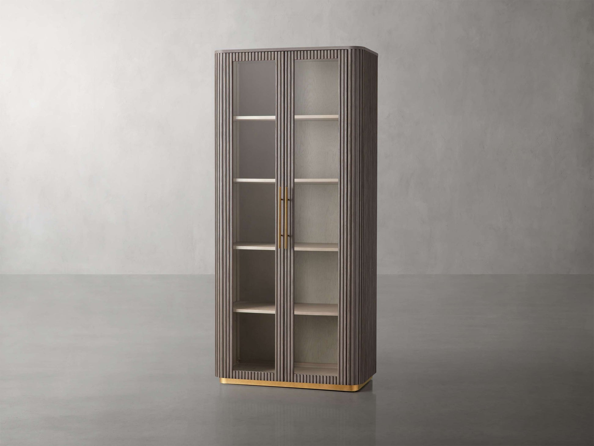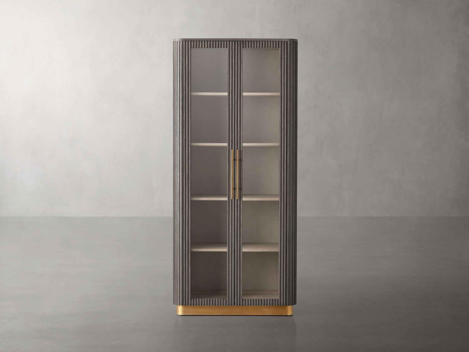 • Cabinet doors are crafted from tempered glass and are complemented by brass pulls.