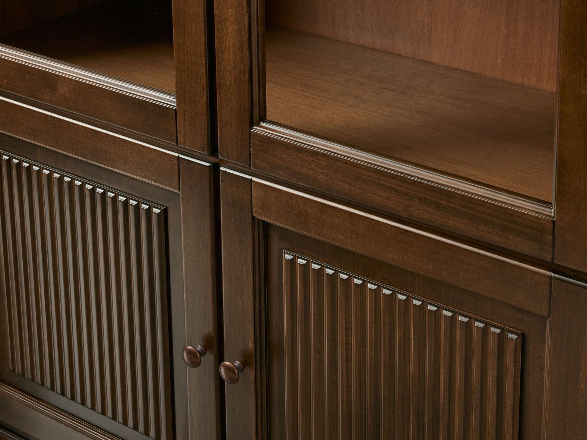 • Each cabinet includes three shelves behind the glass doors (top shelf is fixed, other two are adjustable) and two adjustable shelves behind the bottom wooden doors (one shelf on each side).