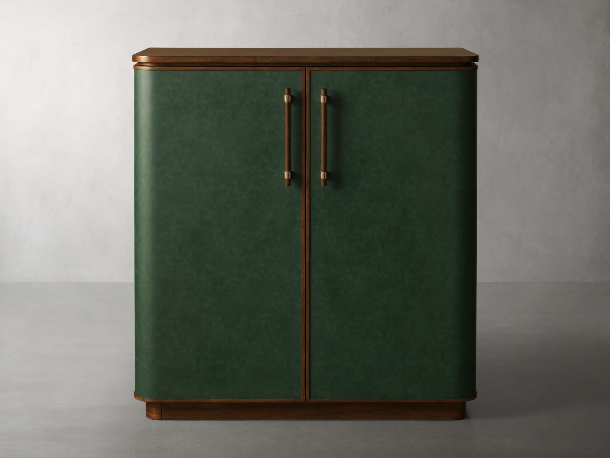 Bold and balanced, our Grant Bar Cabinet is a blend of carefully selected elements that mingle together in artful proportion. Featuring natural walnut wood with a rich, hand-applied finish, green-toned faux leather, and brass-finished accents—Grant keeps barware essentials close and ready for entertaining with plenty of storage and style.