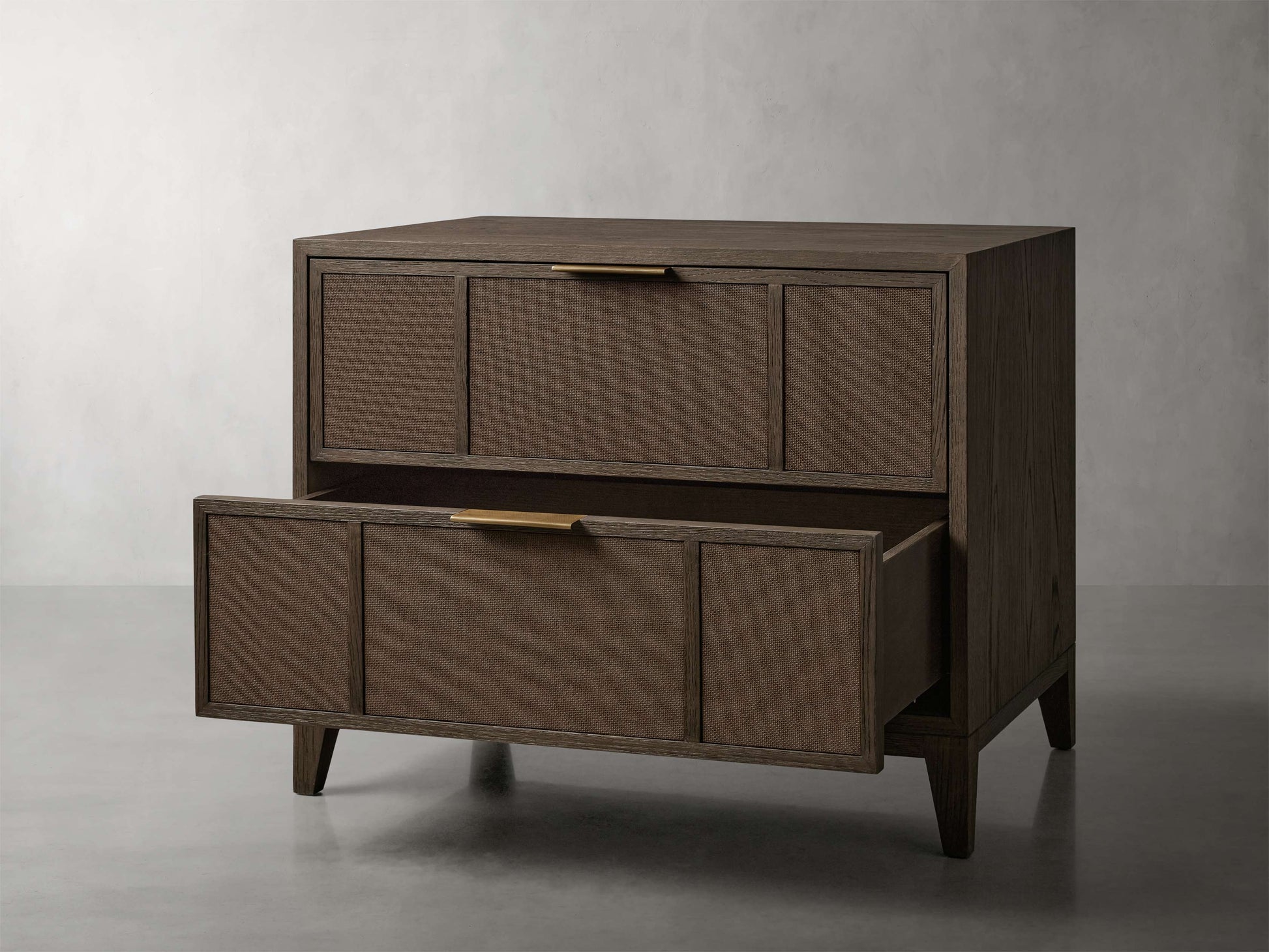 • Crafted from a blend of solid oak wood and oak veneers with textured raffia drawer fronts.