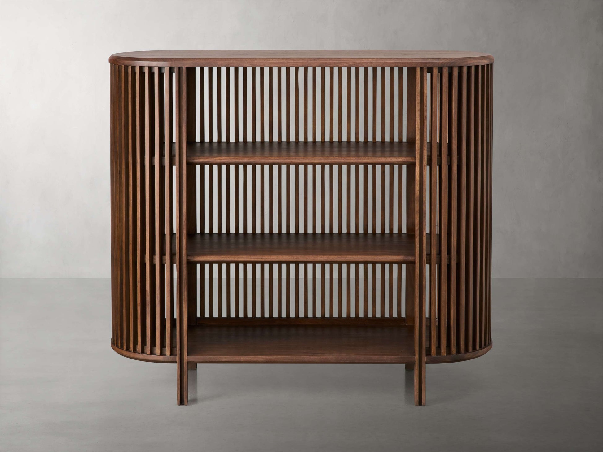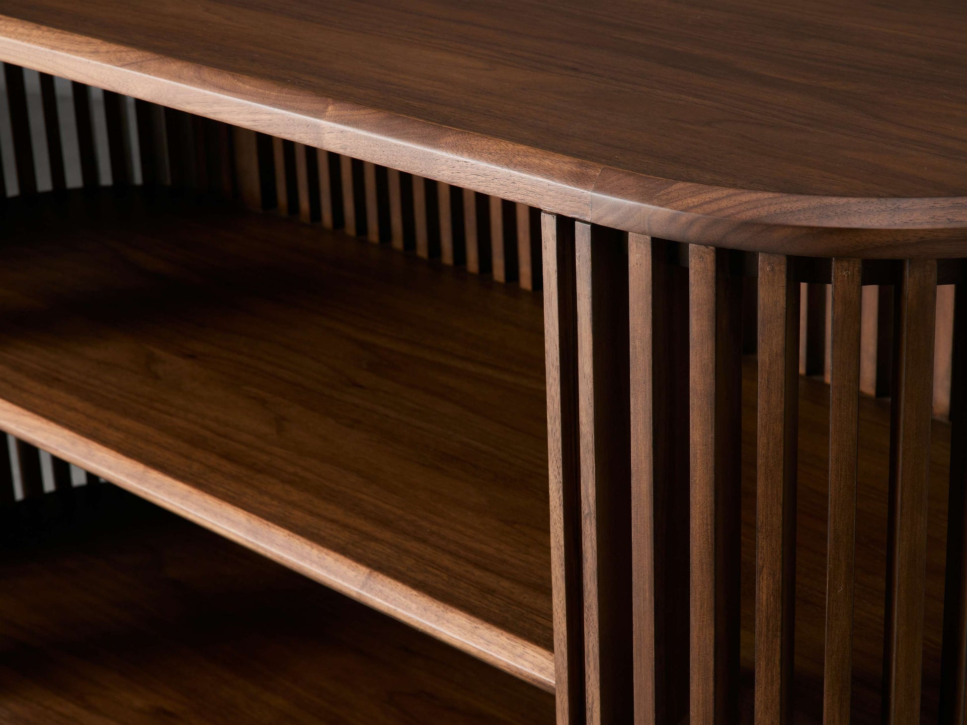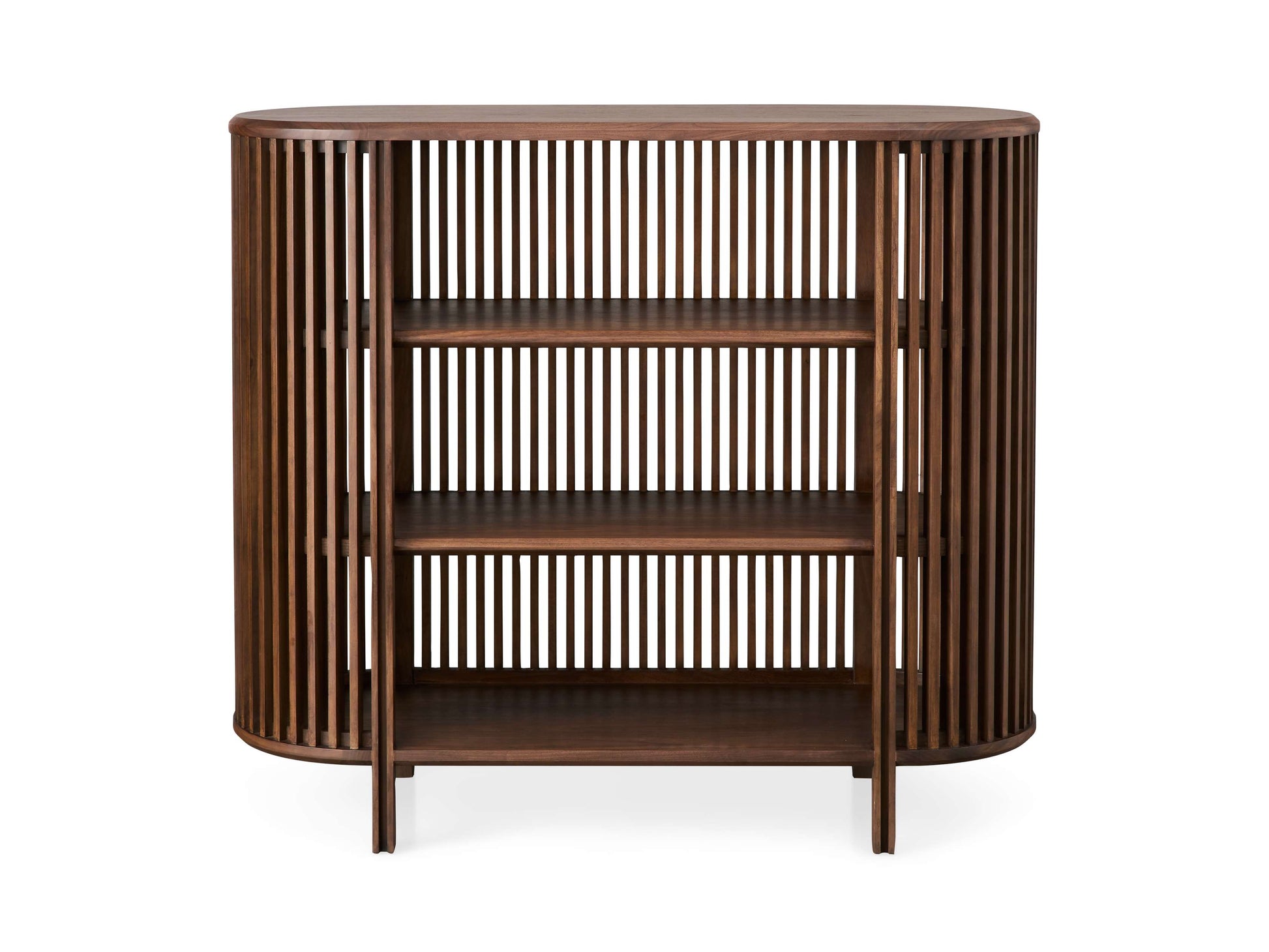 Display your favorite trinkets or keep your barware close at hand with our Paige Collection. Crafted from beech wood and walnut veneers, Paige’s linear open-reeded detailing surrounds the entire piece so it can float in a room. Boasting soft curves and wide fixed shelving, Paige is a stunning, open-storage solution.