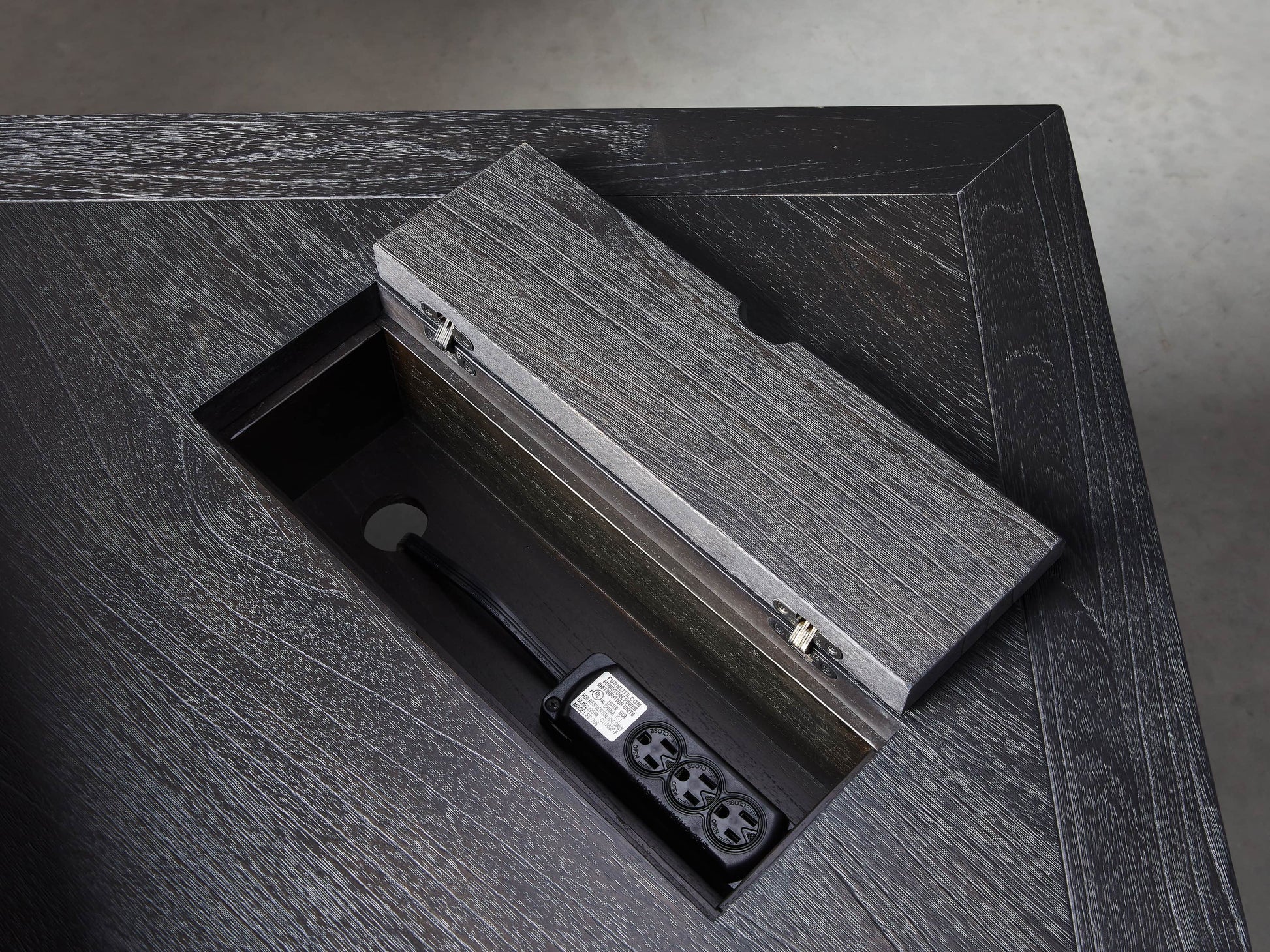 • Top features hidden compartment for office supplies, three-plug media outlet and two removable trays.