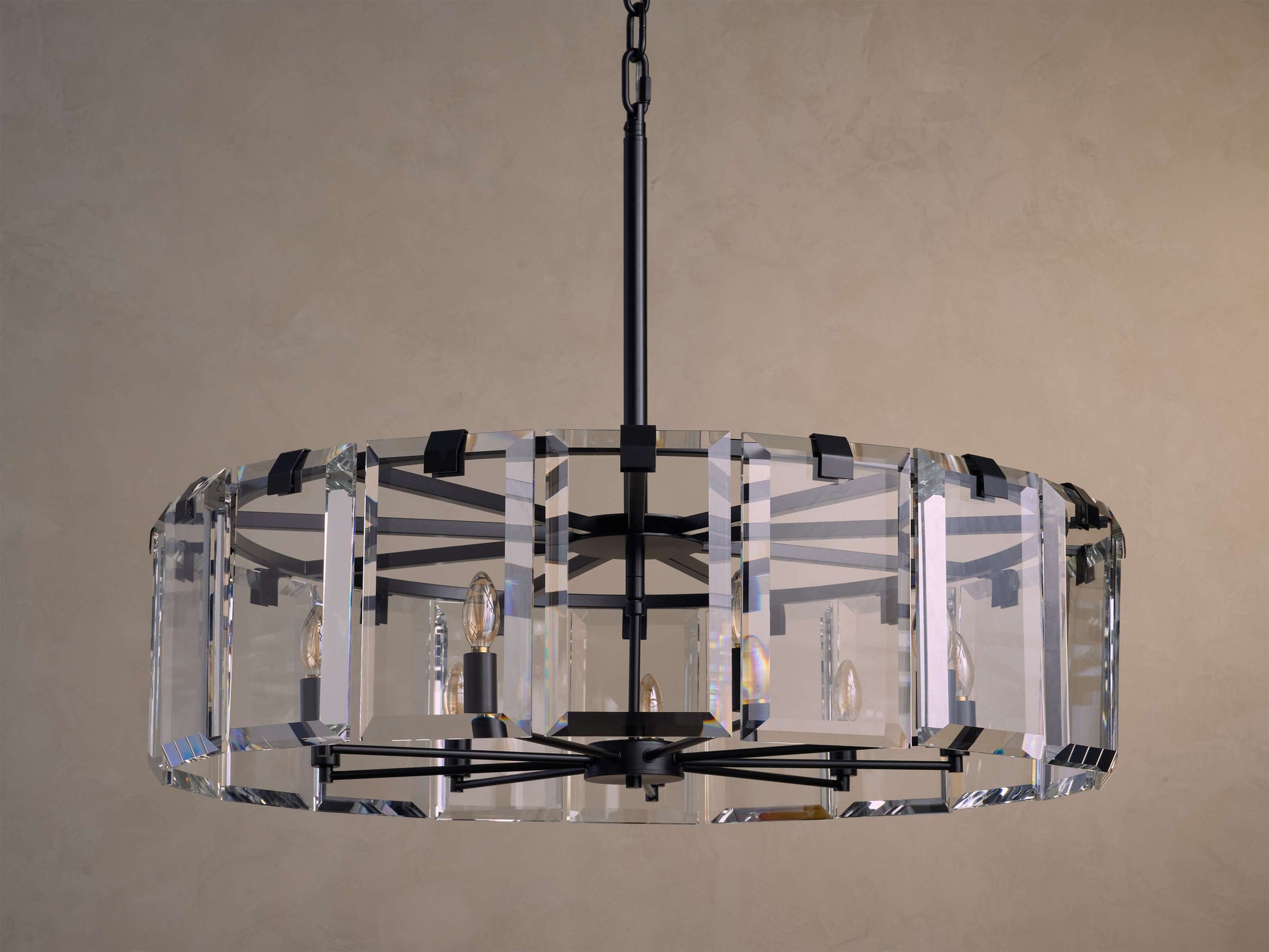 Boasting a thoughtful juxtaposition of clear crystals and sleek black-finished or brass-plated iron, our stunning Amaya Collection creates an artful display of illumination for living spaces, dining rooms, and beyond.