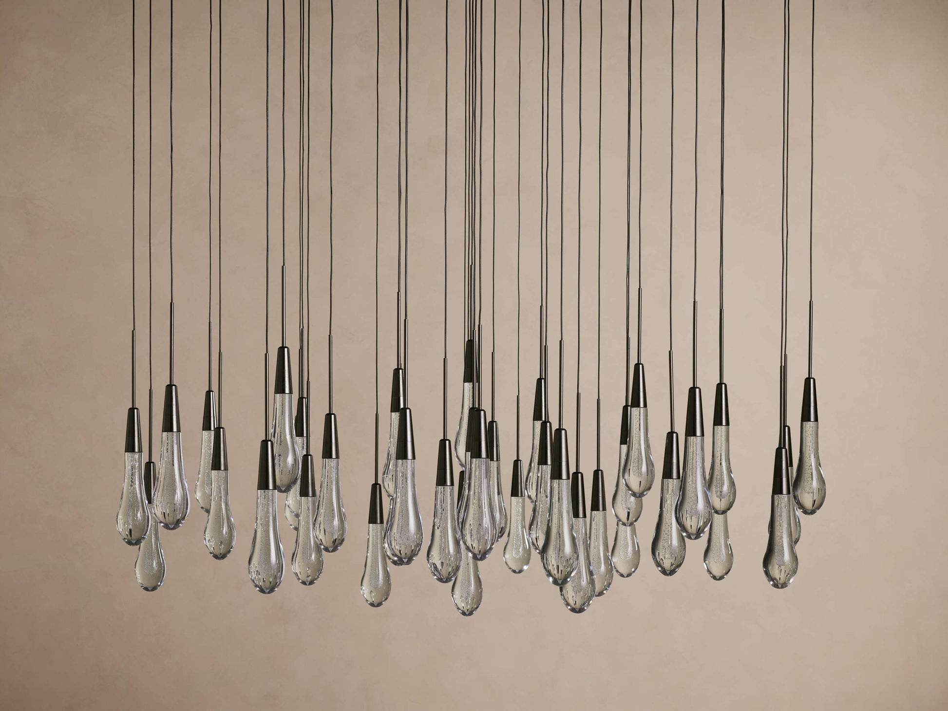 Featuring adjustable black PVC cords cascading into integrated LED lights handcrafted from seeded glass, our Soltaire Lighting Collection mimics the look of a fallen raindrop.
