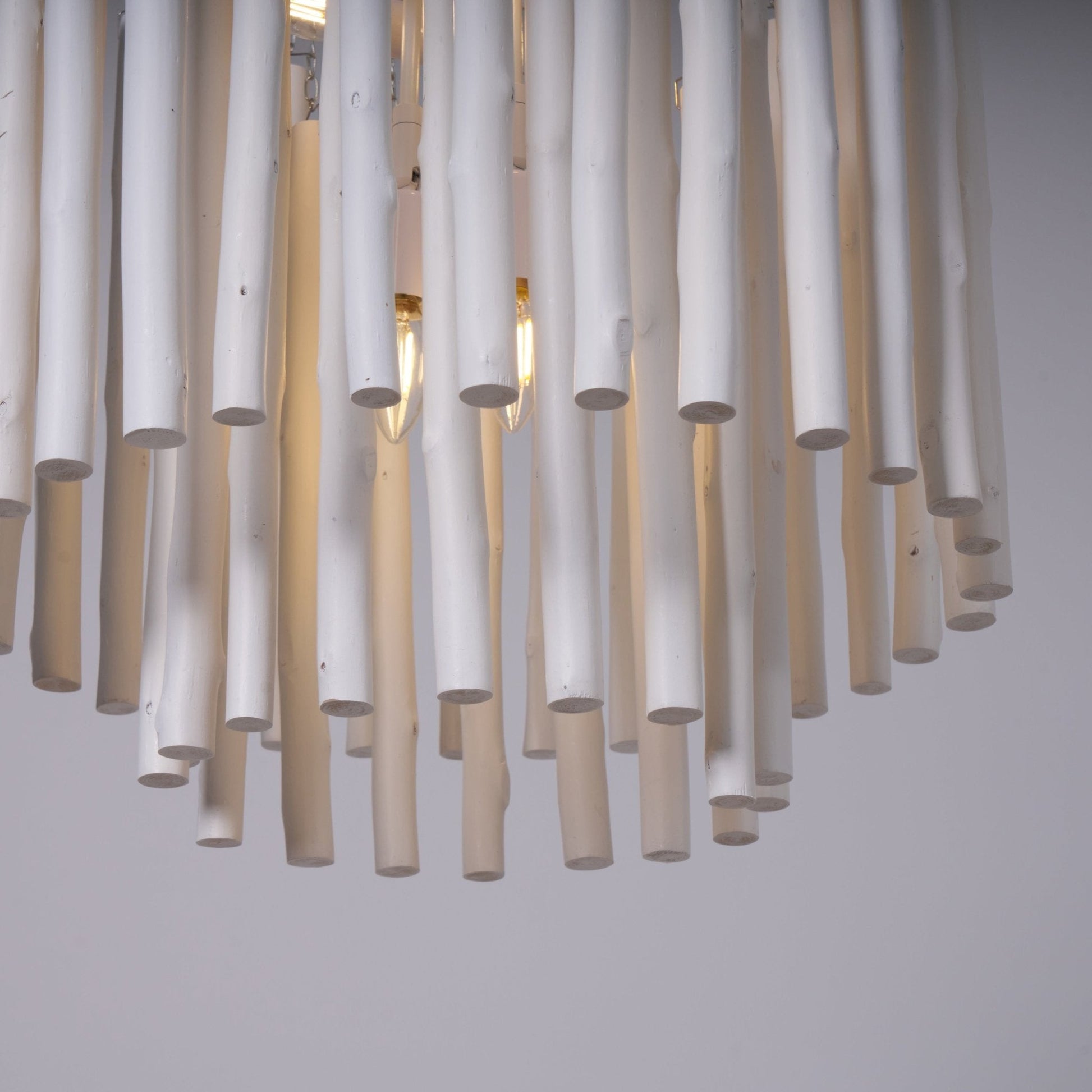 Enhance any space with the unique and charming Swinton Chandelier. Crafted with layered wooden rods and curved iron arms, each piece boasts a one-of-a-kind shape and size due to the natural characteristics of the wood. Available in black or white, this chandelier is a perfect blend of natural elements and modern design.
